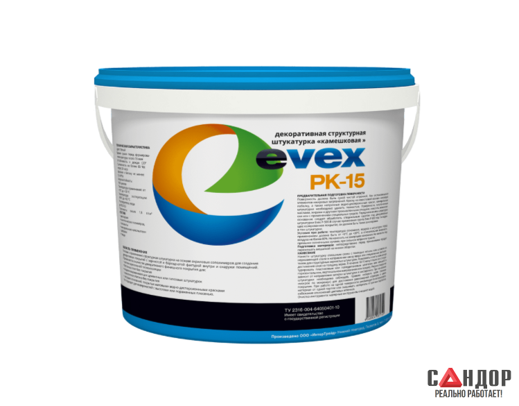 Акриловая декоративная штукатурка Evex PK-15 base A «камешковая» 1,5 мм, 25 кг — это готовая к применению штукатурка с зернистой фактурой на основе водной дисперсии акриловых смол.