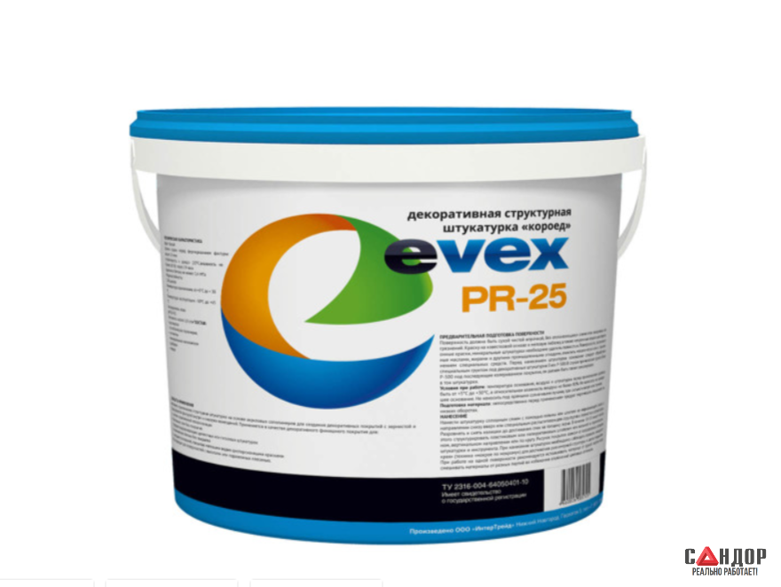 Акриловая декоративная штукатурка Evex PR-25 base C «короед» 2,5 мм, 25 кг — это готовая к применению штукатурка с бороздчатой фактурой на основе водной дисперсии акриловых смол.