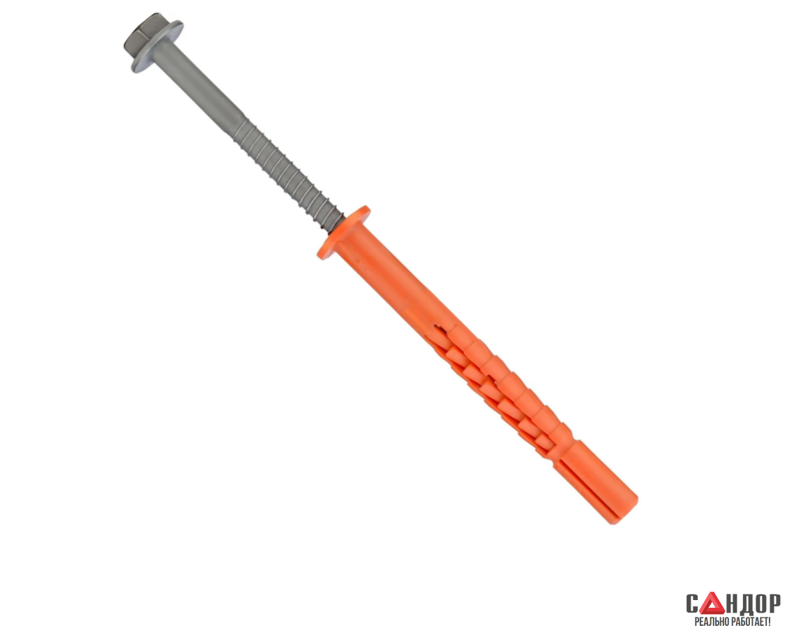 Анкерный дюбель EJOT SDP-KB состоит из двух элементов: распорной втулки из полиамида и шурупа из стали, оцинкованной горячим методом. Сверху у гильзы имеется плоский буртик, ниже которого последовательно расположен гладкий цилиндрический участок и две зоны разжима.