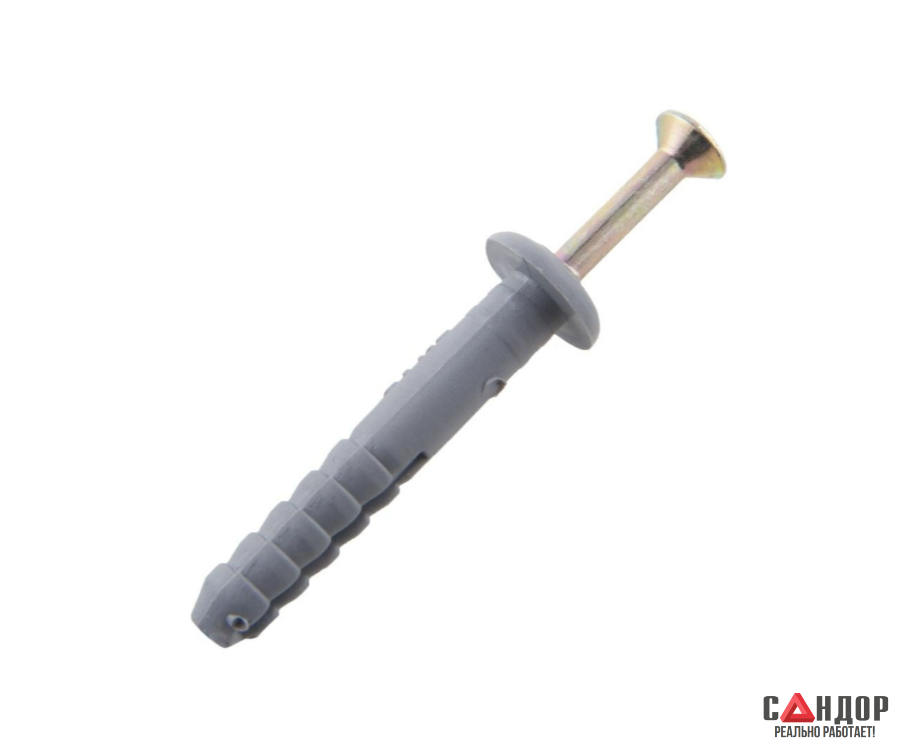 Дюбель с шурупом 6х60 мм с воротником под молоток — это полипропиленовый распорный дюбель с грибовидным бортиком и стальной оцинкованный гвоздь-шуруп для быстрого монтажа.