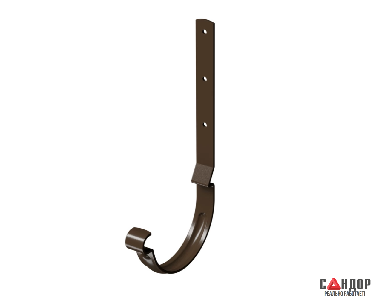 Карнизный крюк длинный — это усиленный элемент крепежной системы, предназначенный для монтажа водосточного желоба диаметром 125 мм на лобовую доску. Изделие выполнено в насыщенном цвете "Каштан" и относится к премиум-серии Docke Stal Premium.