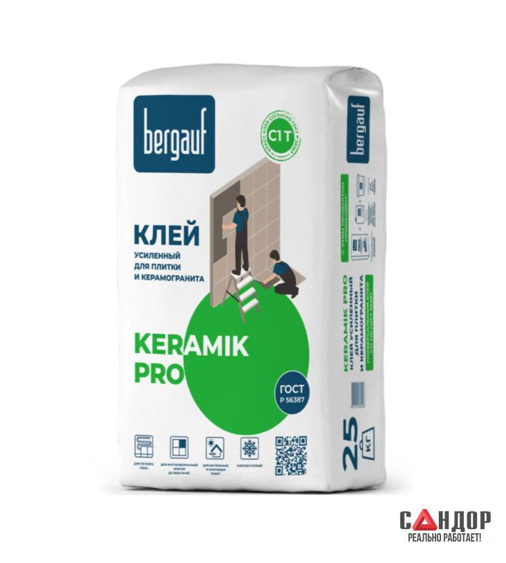 Bergauf Keramik Pro - клей на цементной основе. Широко применяется для облицовки пола и стен, в помещениях с повышенной влажностью, а также для фасадных работ (цоколь, балкон).