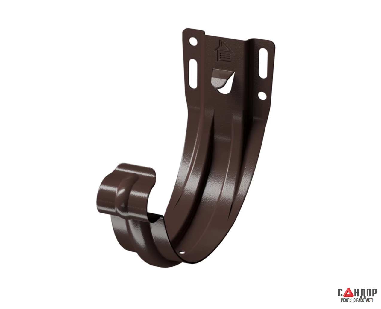 Карнизный штампованный кронштейн — это элемент крепежной системы, предназначенный для фиксации водосточного желоба диаметром 125 мм на лобовой (ветровой) доске. Изделие относится к премиальной серии Docke Stal Premium и сочетает в себе надежность стальной конструкции с эстетикой полимерного покрытия насыщенного шоколадного оттенка.