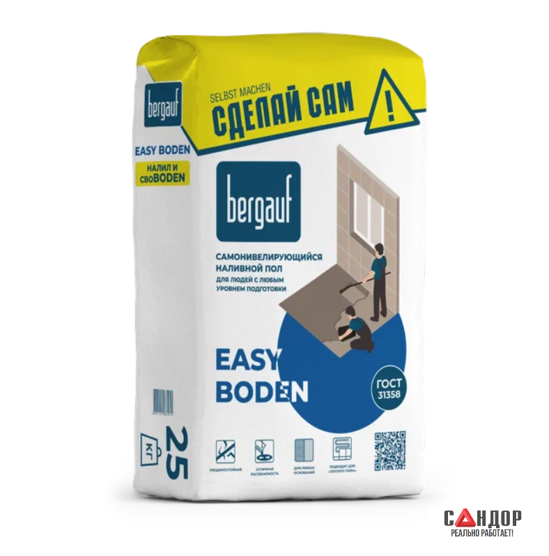 Bergauf Easy Boden — самонивелирующийся наливной пол на цементной основе. Предназначен для выравнивания бетонных и цементно-песчаных оснований с неровностями до 80 мм.
