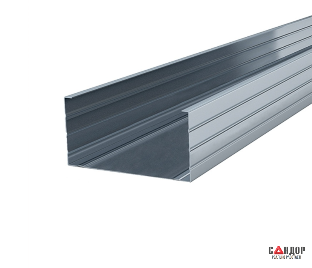 Стоечный профиль формирует плоскость, которая служит основой для фиксации листов. Элемент имеет С-образную форму, загнутые боковые стенки увеличивают жесткость получаемой конструкции.