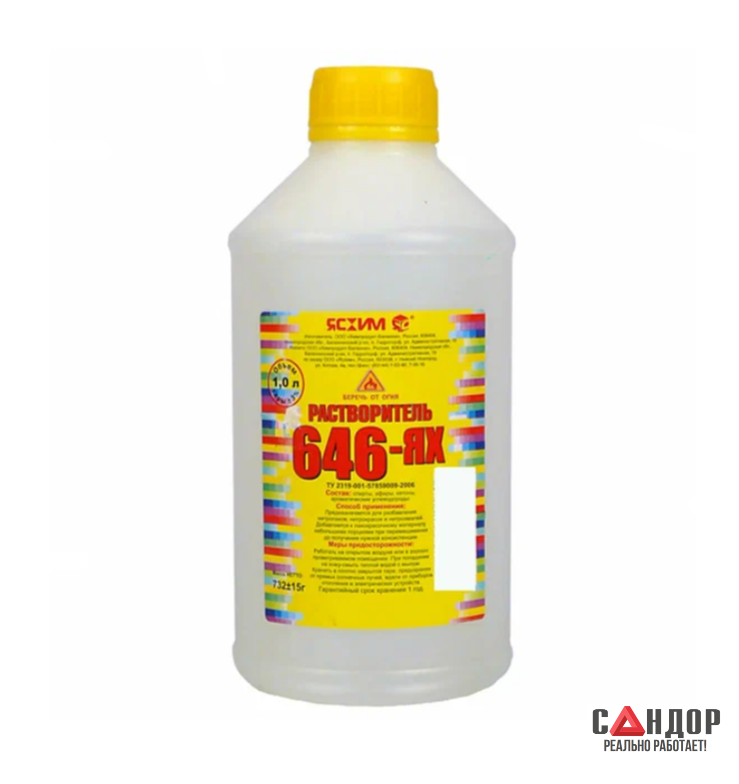 Растворитель-646 — это прозрачная желтоватая или бесцветная жидкость со специфическим резким запахом. Представляет собой смесь летучих органических жидкостей: ароматических углеводородов, кетонов, спиртов и эфиров.