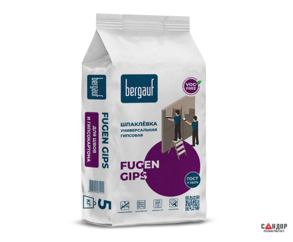 Шпатлевка гипсовая BERGAUF Fugen Gips (5 кг) - Это сухая гипсовая смесь, специализированная для заделки швов между листами гипсокартона (ГКЛ, ГВЛ) и армирования их стыков серпянкой или бумажной лентой. Является ключевым материалом для подготовки гипсокартонных конструкций под финишную отделку.