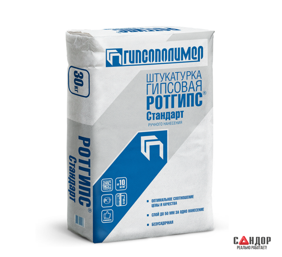 Гипсовая штукатурка «Ротгипс Стандарт» 30 кг — это высокопрочный материал для отделки стен и потолков. Состоит из гипса, минеральных наполнителей и полимерных добавок.