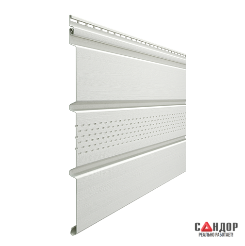 Софит DOCKE PREMIUM T4 с центральной перфорацией "Пломбир" — это виниловая панель для подшивки свесов, у которой перфорирована только центральная продольная полоса (обычно шириной 50-70 мм), а края остаются сплошными. Это обеспечивает вентиляцию подкровельного пространства, сохраняя при этом визуальную "монолитность" и аккуратный вид свеса.