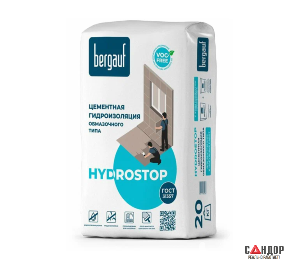 Bergauf Hydrostop — цементная гидроизоляция обмазочного типа. Предназначена для защиты основания от проникновения влаги.